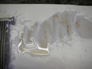 Radiátor bol takmer neprietočný,až otočenie smeru vodu začala vytekať.Po chvíle trápenia voda začala celkom slušne pretekať,tak som chcel už iba vyfúkať vodu.Už prvé fúknutie prinieslo prekvapenie vo forme jemnučkého piesku.